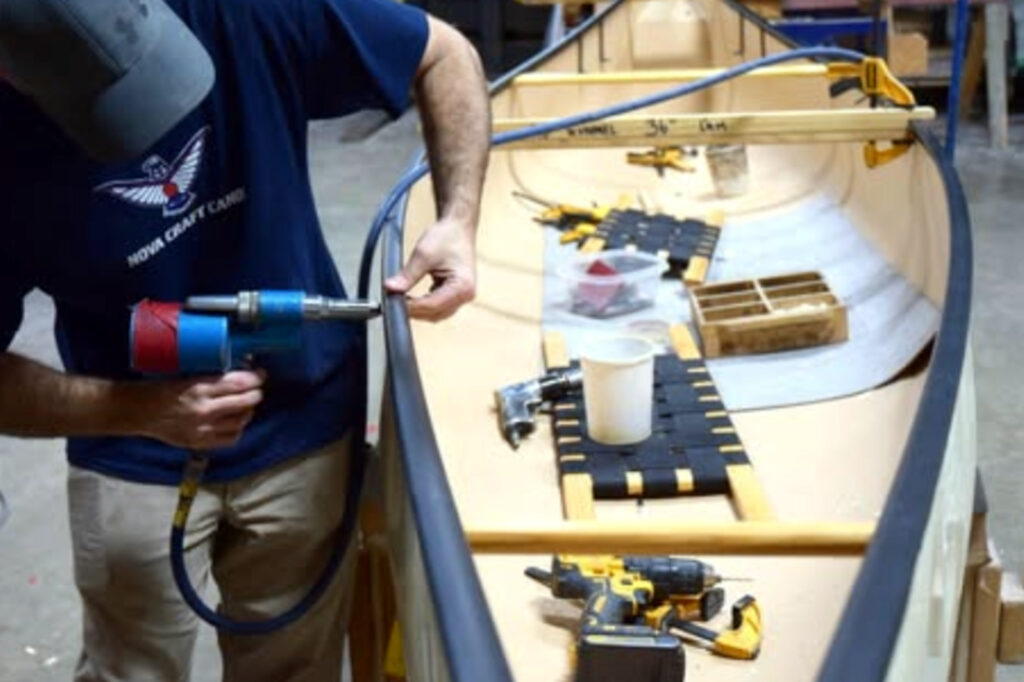 👉 Das Foto zeigt einen Süllrand-Einbau bei einem TuffStuff-Boot in der Manufaktur in Kanada. Es gibt standardmäßig den schlanken und leichten Alu-Süllrand bei allen laminierten Booten. Die Aramid Lite und Blue Steel Canadier haben einen nochmals schlankeren Alu-Süllrand.