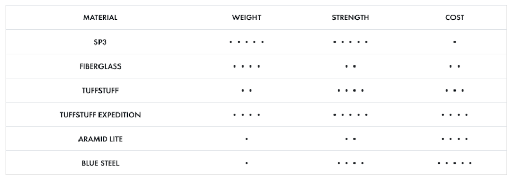 Von links nach rechts: Fiberglass (GFK), TuffStuff & TuffStuff Expedition, Aramid Lite, Blue Steel